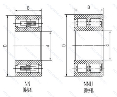 Двухрядный цилиндрический роликоподшипник. Коническое отверстие позволяет регулировать внутренний зазор. Имеются масляная канавка и масляное отверстие в центре наружного кольца.