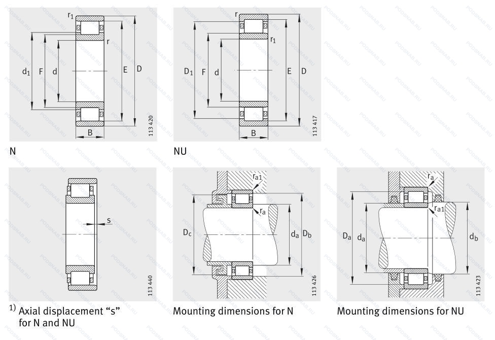 | N 232 | Однорядный цилиндрический роликовый подшипник. Внутреннее кольцо подшипника имеет два борта. Два смещенных на 180° стопорных паза на наружной поверхности наружного кольца подшипника. |
