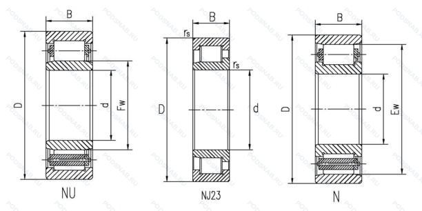 | Обозначение | Конструктивные особенности | Внутренний (d) | Наружный (D) | Ширина (B) |