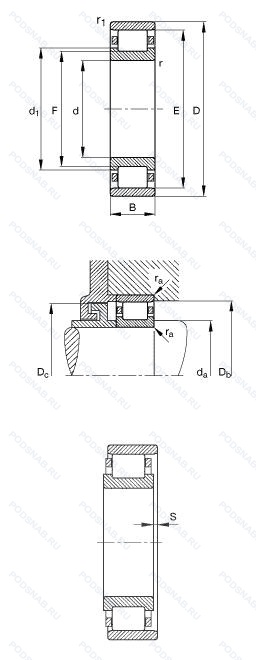 Однорядный цилиндрический роликоподшипник. Внутреннее кольцо подшипника имеет два борта, наружное — без бортов, цельный прессованный сепаратор.