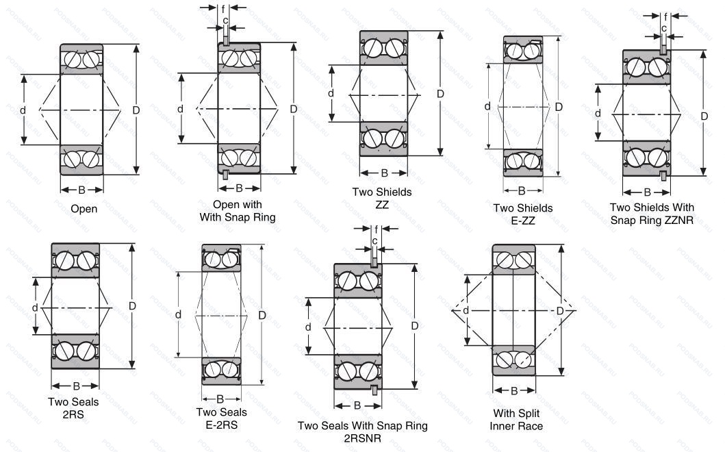 Резиновые уплотнения с каждой стороны подшипника, канавка под стопорное кольцо на наружном кольце с соответствующим стопорным кольцом.