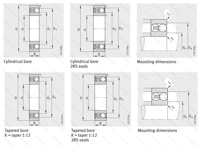| Обозначение | Конструктивные особенности | Внутренний (d) | Наружный (D) | Ширина (B) |