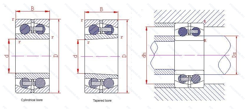 | Обозначение | Конструктивные особенности | Внутренний (d) | Наружный (D) | Ширина (B) |