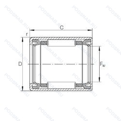 Игольчатый роликоподшипник со штампованным наружным кольцом и открытыми торцами, манжетное уплотнение с двух сторон, fluorcarbon (viton®) - seal of series g. made from fluoro rubber, особенность внутренней конструкции.