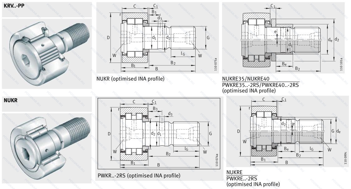 NUKR+E. Опорный ролик, с цапфой, с корончатым наружным диаметром (две дорожки цилиндрических роликов). Эксцентриковая цапфа, шестигранная гайка, двухрядный радиально-упорный шарикоподшипник без отверстия для смазки.