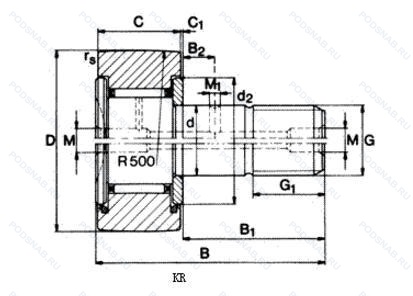 KR+E. Опорный ролик, шпилечного типа с сепаратором, профилированный наружный диаметр.