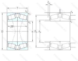 | 30236J/DF | Дорожки качения наружного кольца. угол контакта и ширина наружного кольца в соответствии с ISO. Комплект из двух подшипников. согласованных для установки по Х-образной схеме. Число. следующее непосредственно после букв DF. обозначает конструкцию промежуточного кольца. |
