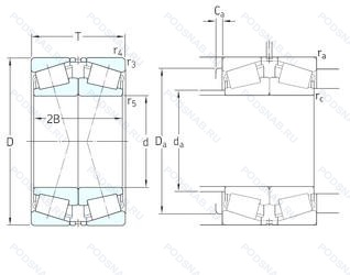 | 32014-X-DF | Измененные размеры границ. введенные пересмотренными стандартами ISO. Комплект из двух подшипников. согласованных для установки по Х-образной схеме. Число. следующее непосредственно после букв DF. обозначает конструкцию промежуточного кольца. |