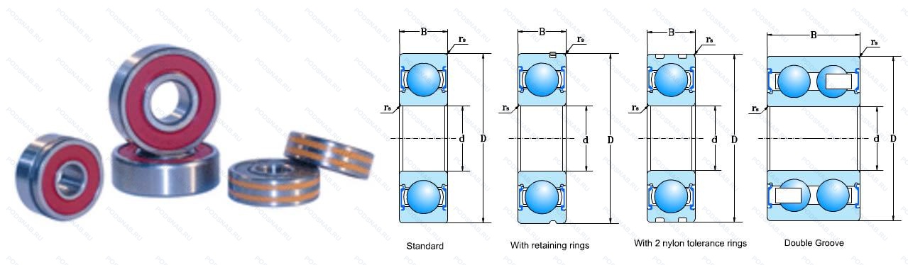 | Обозначение | Конструктивные особенности | Внутренний (d) | Наружный (D) | Ширина (B) |