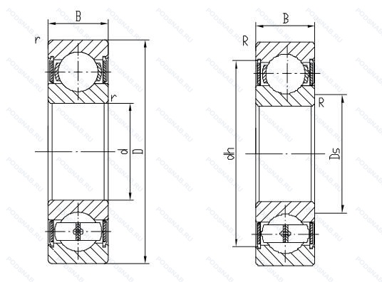 | 6205LLBNR | Канавка и стопорное кольцо на наружном кольце. Бесконтактное нитриловое уплотнение. |