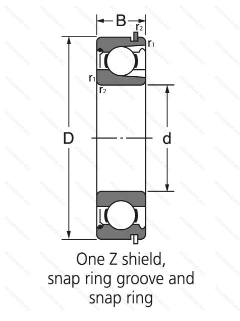 | 6305.2ZRN | ISO | Защитные металлические шайбы с обеих сторон. Канавка под стопорное кольцо на внешнем кольце. |