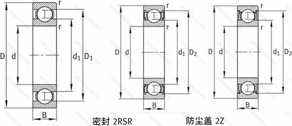 | Обозначение | Конструктивные особенности | Внутренний (d) | Наружный (D) | Ширина (B) |