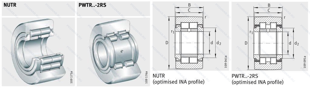 | NUTR25DZ | Опорные ролики игольчатого типа. Цилиндрический наружный диаметр. Литой сепаратор оконного типа из полиамида. усиленного стекловолокном. |