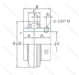 | UC206EN2 | Два установочных паза (выемки), расположенных под углом 180° друг от друга в одной боковой поверхности наружного кольца или шайбе корпуса.. |