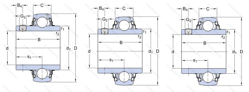 | UC205EN2 | ISO | Два установочных паза (выемки), расположенных под углом 180° друг от друга в одной боковой поверхности наружного кольца или шайбе корпуса.. |
