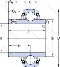 | UC205EN2 | ISO | Два установочных паза (выемки), расположенных под углом 180° друг от друга в одной боковой поверхности наружного кольца или шайбе корпуса.. |