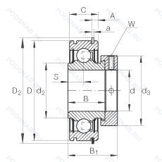 Метрическая широкая внутренняя часть, манжетные уплотнения с обеих сторон (тип p — две шайбы из оцинкованной листовой стали с промежуточной частью из nbr. кромка уплотнения предварительно нагружена в осевом направлении), slot and snap ring for radial insert ball bearings with cylindrical outer ring.
