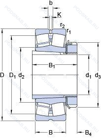 | 22220B D1 | Цельное ребристое внутреннее кольцо. Асимметричные ролики и фиксатор с центральной направляющей. Канавка для смазки и три отверстия во внешнем кольце подшипника. |