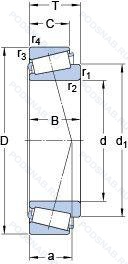 | 32248DF | Комплект из двух подшипников. согласованных для установки по Х-образной схеме. Число. следующее непосредственно после букв DF. обозначает конструкцию промежуточного кольца. |