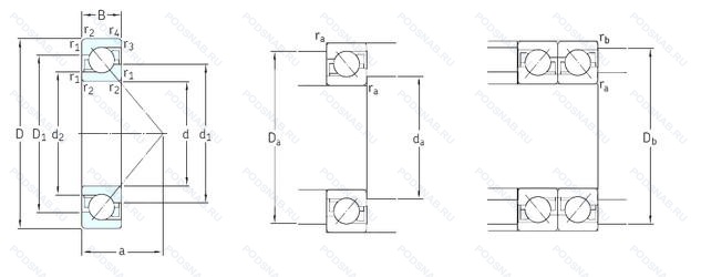 | 7038DF | Комплект из двух подшипников. согласованных для установки по Х-образной схеме. Число. следующее непосредственно после букв DF. обозначает конструкцию промежуточного кольца. |