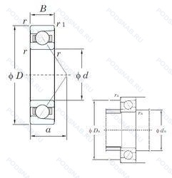 | 7240DF | Комплект из двух подшипников. согласованных для установки по Х-образной схеме. Число. следующее непосредственно после букв DF. обозначает конструкцию промежуточного кольца. |
