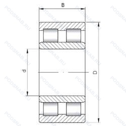 Двухрядный цилиндрический роликоподшипник. Коническое отверстие позволяет регулировать внутренний зазор. Имеются масляная канавка и масляное отверстие в центре наружного кольца, канавка под стопорное кольцо на наружном кольце подшипника.