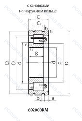 | 692315-КМ1 | Кольцевая проточка на середине цилиндрической наружной поверхности наружного кольца плюс три отверстия для смазки. Модифицированный контакт.. |