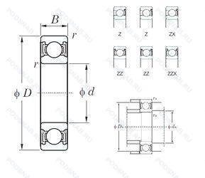 | Обозначение | Конструктивные особенности | Внутренний (d) | Наружный (D) | Ширина (B) |