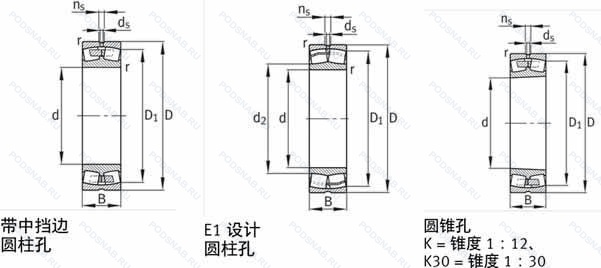 | 22322-E-K-W33 | Канавка для смазки и три отверстия во внешнем кольце подшипника. Коническое отверстие. Конусность 1/12. Повышенная грузоподъемность. |