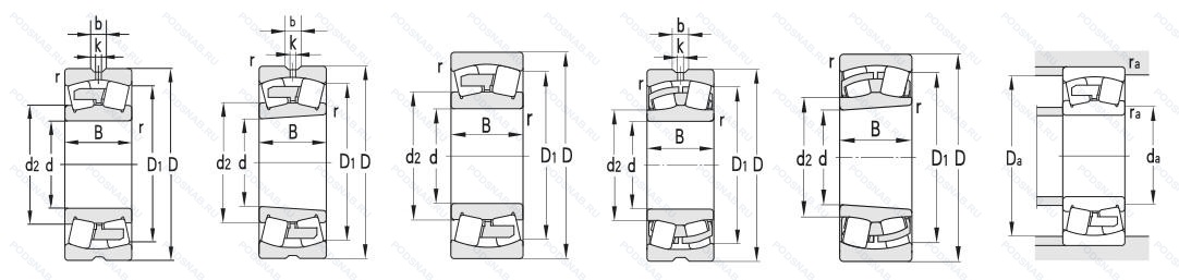 | 22315VJW33 | Канавка для смазки и три отверстия во внешнем кольце подшипника. Стальной сепаратор из 2 частей - пальцевый тип. |