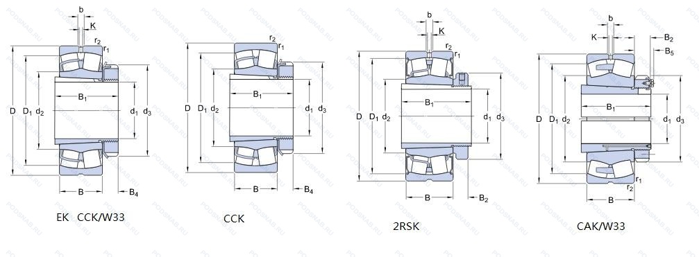 | 22219-E-W33 | Канавка для смазки и три отверстия во внешнем кольце подшипника. Повышенная грузоподъемность. |