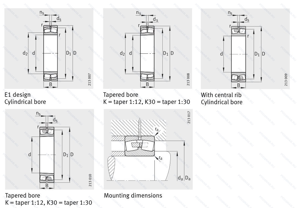 | 24132E1-K | Коническое отверстие. конус 1/12. Конструкция с увеличенной грузоподьемностью. |