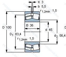 | 22309CK D1 | С симметричными роликами. Коническое отверстие. конус 1/12. Канавка для смазки и три отверстия во внешнем кольце подшипника. |