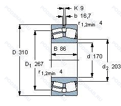 Модификации сферического роликового подшипника 22234.EKMW33 — это измененное основное конструктивное исполнение 22234, основные размеры (170x310x86) не отличаются.