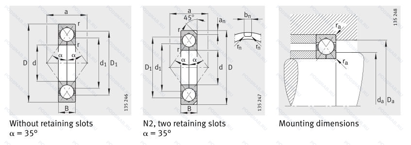 | QJ 1952 N2 | Шариковый радиально-упорный однорядный подшипник. Два установочных паза (выемки), расположенных под углом 180° друг от друга в одной боковой поверхности наружного кольца или шайбе корпуса.. | 260.00 | 360.00 | 46.00 |